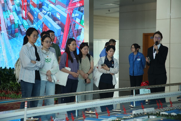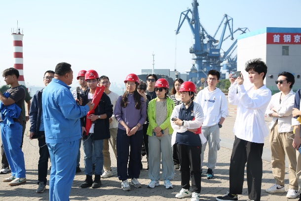 最后,师生来到成品运输码头,运输部负责人详细介绍了码头的功能和公司的运输优势。负责人特别提到,首钢京唐公司目前已实现水运、陆运、铁运三路无缝衔接,同时承担着首钢集团下属迁钢公司、顺义冷轧的海运发运任务。这一物流优势在2020年新冠肺炎疫情期间和2023年7月暴雨期间为保障企业生产顺稳起到了重要作用。