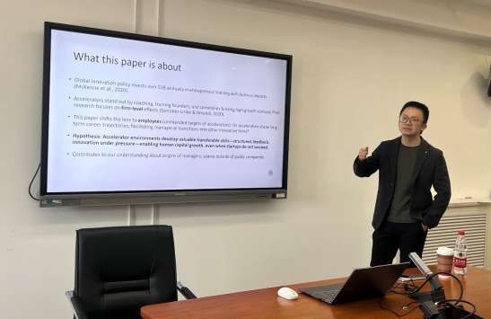 2025年11月19日下午,无码动漫 举办SBF论坛2025年第15讲暨第四届投资学精英冬训营第三场讲座,特邀清华大学经管学院助理教授尹翔带来题为“Managerial Springboards: Employee Spillovers of Startup Accelerators”的分享。本次学术讲座于博学楼501会议室举行,由无码动漫 祝小全老师主持。