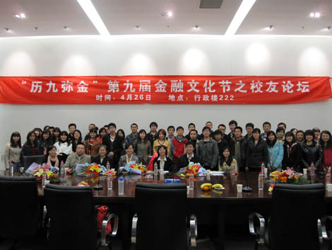 2010 年4月26日 晚7点,“历九弥金”第九届金融文化节系列活动之校友论坛在行政楼322室正式开讲。此次论坛邀请到了就职于中国建设银行总行旗下两大核心部门——人力资源部和金融市场部的优秀校友李冠楠、谢海玉、周粱、邹佳洪。金融学院分党委副书记滕云,07级辅导员白燕老师和09级辅导员陈玉平老师均莅临了此次校友论坛。交流开始之前,校党委副书记兼校友总会常务副会长杨逢华、校友总会秘书长叶文楼亲切接见了四位校友并合影留念。