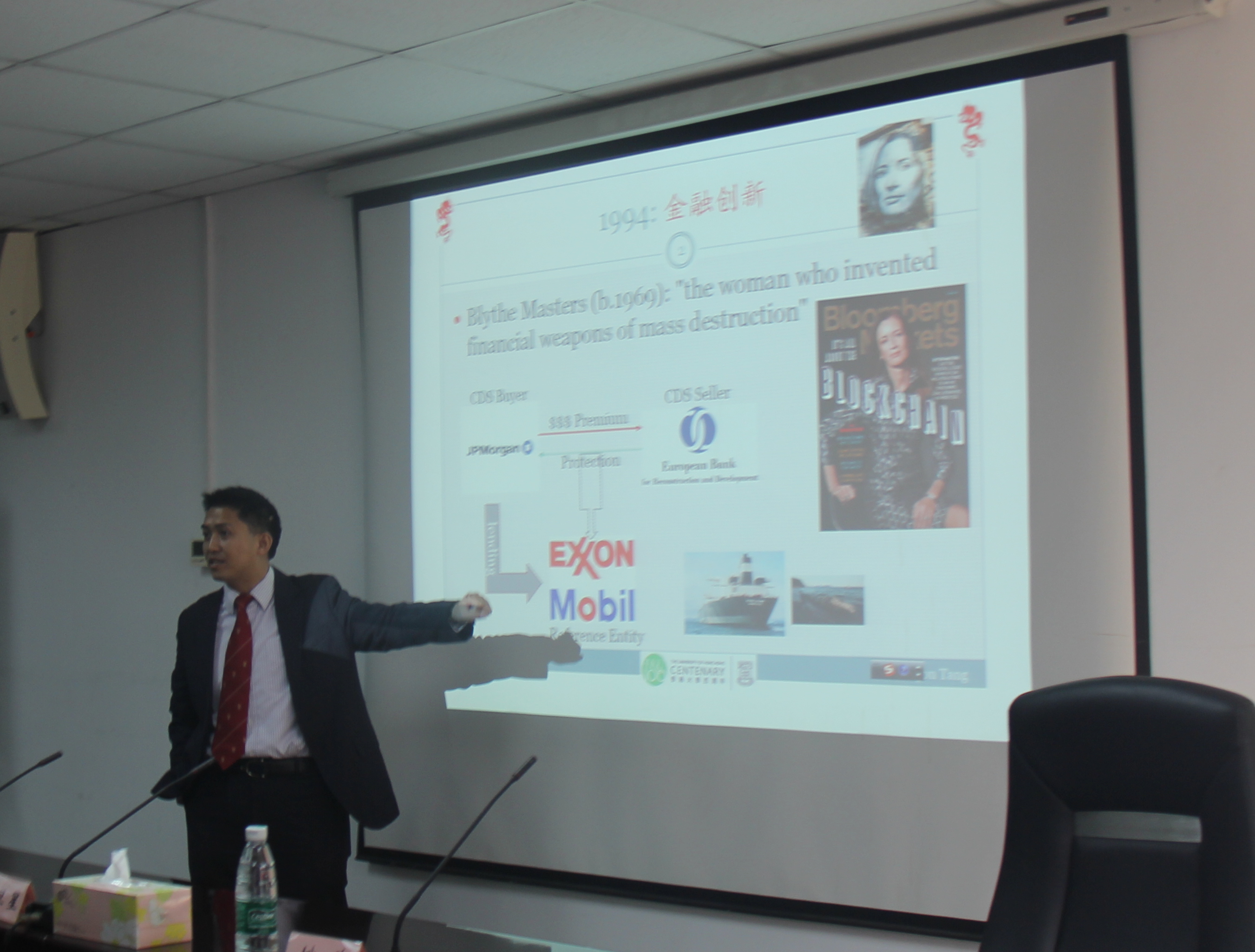 汤教授通过丰富而生动的案例就CDS衍生品的产生和发展情况、行业协会ISDA(International Swaps and Derivatives Association)、CDS的种类和规模等情况做出了简要介绍;随后就CDS的流动性问题,CDS杠杆买卖问题,CDS与公司现金持有、银行贷款、银行资本监管、借款人风险的关系,以及CDS市场的外部性问题进行了深入地分析,并通过频繁地问答与大家进行了广泛地交流。