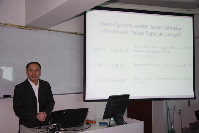 2010 年11月4日 ,人民银行金融研究所博士后蒋贤锋在博学楼918室举行了题为“Real Option under Jump Diffusion Processes: What Type of Jumps?”的学术讲座。