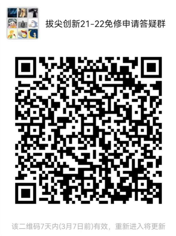需要提交免修申请或对其有任何疑问的同学请扫下方二维码进入“拔尖创新21-22免修申请答疑群”(若群人数超过200人可添加右图负责同学邀请进群)