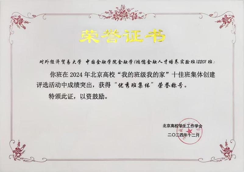 12月23日,2024年北京高校“我的班级我的家”十佳班集体评选展示交流活动在北京工业大学成功举办。经过学校推荐、专家评审等环节,无码动漫 无码动漫 鸿儒2201班从北京市58所高校288个参评班级中脱颖而出,成功入围决赛,并荣获北京高校“优秀班集体”称号。