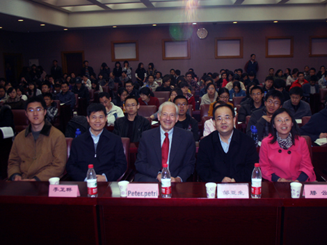 本次讲座全过程Peter Petri教授用英文进行演讲,共分四个模块探讨了世界经济的风云变幻。在第一个模块“2030世界变动”中他预测,在二十年后的2030年,中国对世界的影响力将扩大,贸易、能源、环境、城市化、合作与冲突等一系列的问题将变得尤为关键。而之后的第二、第三个模块,Peter Petri教授通过历史的进程证实了他的这一预测并非无稽之谈。一番对未来的展望、历史的回顾后,教授在最后一个模块“应对措施”中为当下的中国提供了国内国际经济发展的建议。对于国内的经济,他建议拉动消费、注意环境与能源的关系、增强国际合作;对于国际发展,他提出中国应担当起大国的责任,积极贸易往来。现场观众对教授的提议深表赞同。