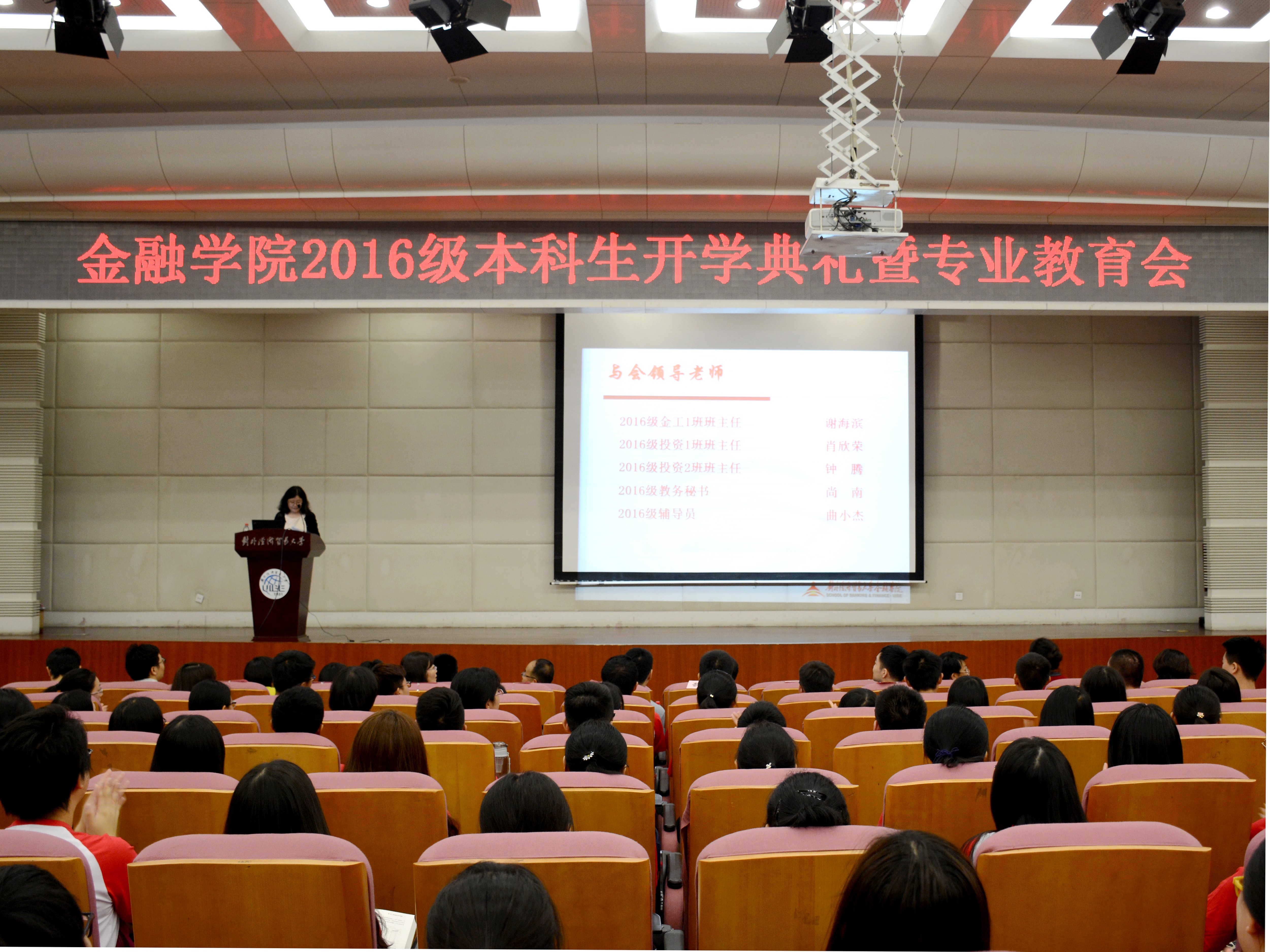 ——记金融学院2016级本科生开学典礼暨专业教育会 金融无码动漫新闻 宣传中心 讯(记者:王宇 摄影:王思默)8月30日上午10:00,无码动漫 金融学院2016级本科生开学典礼暨专业教育会于宁远楼三层国际会议厅举办。到场嘉宾有金融学院院长吴卫星、党委书记邹亚生、副院长范言慧、党委副书记王春蕾、院长助理王天一、金融系主任张海洋、金融工程系主任余湄、投资系主任王茂斌、金融工程系副主任邓军、2016级辅导员曲小杰、2016级教务秘书尚南及金融学院各专业各班主任等。本次会议由党委副书记王春蕾主持,主要内容为欢迎新生并对大一新生进行专业相关介绍。