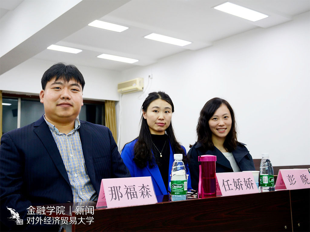 在职研究生暨迈科期货电子商务部负责人那福森,期货黑色金属分析师任娇娇和银河期货有限公司研究员彭晓。讲座现场好不热闹,全场座无虚席,甚至不少学生站在教室后或是席地而坐,期待从中有所收获。