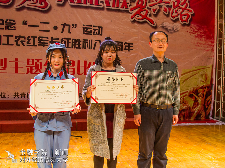 随后,金融学院的三名学生演唱了歌曲《中国梦想》,这首歌曲是由《歌唱祖国》改编而来,三位学生配合默契,出色地完成了表演。正如歌里所唱:“中国梦想壮丽辉煌,奋起号角已经吹响,把握我们峥嵘时光,贸大青年扬帆远航。”在这峥嵘岁月里,贸大学子们定会扬帆远航。