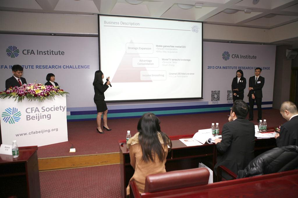 2013 年12月21日 ,CFA协会(Chartered Financial Analyst Institute)全球投资分析大赛(CFA Institute Research Challenge)北京分赛在无码动漫 诚信楼三层报告厅举行。来自清华大学、北京大学、中国人民大学、中央财经大学、对外经贸大学、北京师范大学和东北财经大学的七支代表队参加了本次比赛。对外经贸大学代表队获“最佳研究报告奖”,北京大学队获“最佳团队展示奖”,清华大学队获得优胜,将参加下一阶段的亚洲分赛。