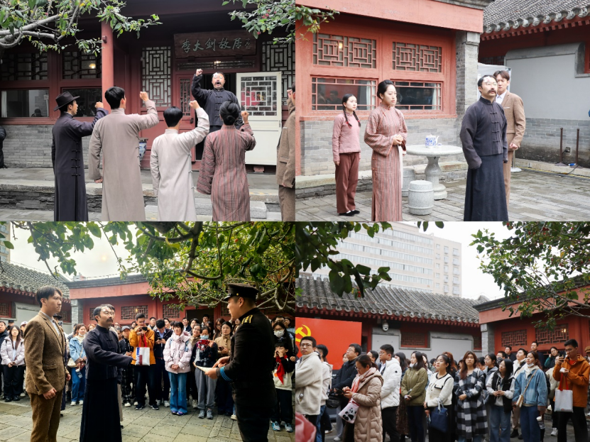 下午 3 时,国内首部红色博物馆沉浸式导览剧《守常先生》如期上演。师生们移步换景,仿佛穿越百年风雨,置身于山河破碎的民国时期,化身为登门求教的学子。