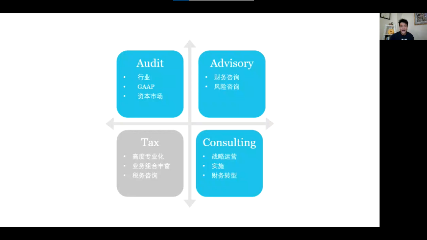 符飞学长首先介绍了“四大”主要业务,即审计、咨询、税务(其中咨询业务可细分为财务咨询、风险咨询和管理咨询),并对各部分的具体工作内容进行讲解。