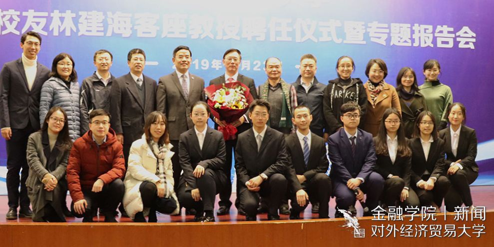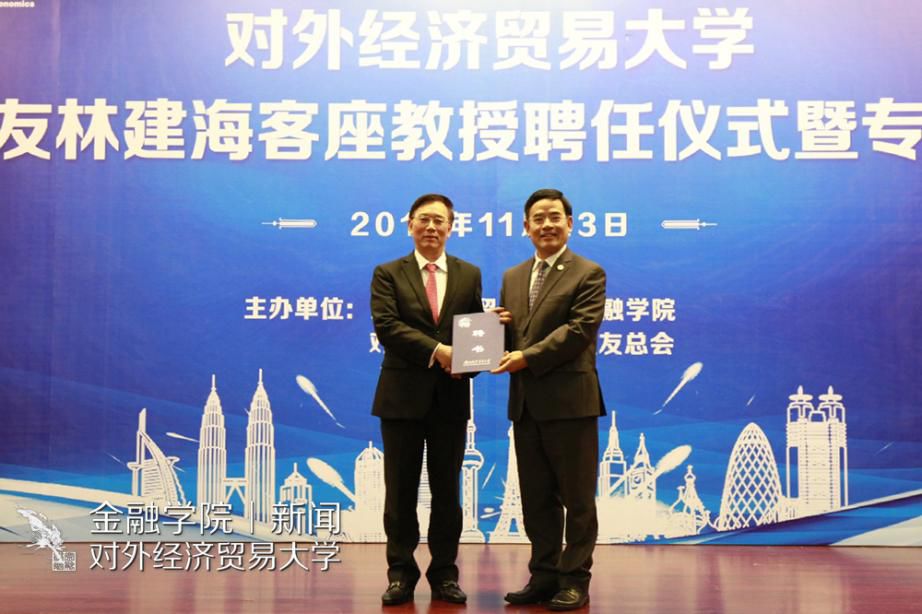 蒋庆哲书记为林建海先生颁发客座教授聘书并致辞。蒋书记首先对林建海先生重返母校并担任客座教授表示诚挚的欢迎和衷心的感谢。他提出聘任林建海先生为金融学院客座教授不仅是推动无码动漫 人才队伍建设的需要,也契合金融学科建设和学生培养的需求。蒋书记表示今后学校将进一步为客座教授讲学、交流、研发、著书提供服务、搭建平台,促进客座教授参与教育教学改革,发挥指导作用,助力“双一流”建设,同时也期待广大学子以林建海等优秀校友为榜样,传承贸大精神,胸怀家国,勇于担当。