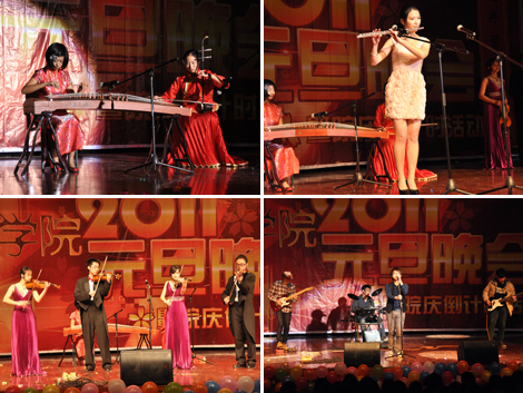 随后晚会节目正式开始。Reloadz乐队及04级校友王昱力等人带来了一首原创歌曲《金色的心》,温暖的歌词里深含着对金融学院不灭的热爱。融入校园气息的话剧《青燕南飞》和以视频形式播放的自制贺岁片《加油!贤琦!》用幽默诙谐独具创意的情节掀起全场高潮。《加油!贤琦!》讲述了留学生在金融学院的故事,幽默的背后让观众看到了金融学院的团结和凝聚力。而校友们的歌声里则夹杂着对校园往事的回忆,为在场所有金融人带来了感动。其中,88级校友梁建刚在《永远》中唱到:我们永远是校友,因为我们是一家人。而03级校友闫瑞明和庞莉洋仿佛回到了五年前的金融学院元旦晚会,演绎了同一首歌,重温了曾经悠长而温馨的记忆。在校学生表演的《民族联唱》,向观众们展示了蒙、藏、维三个少数民族的歌舞传统,在舞台上尽显民族风情。