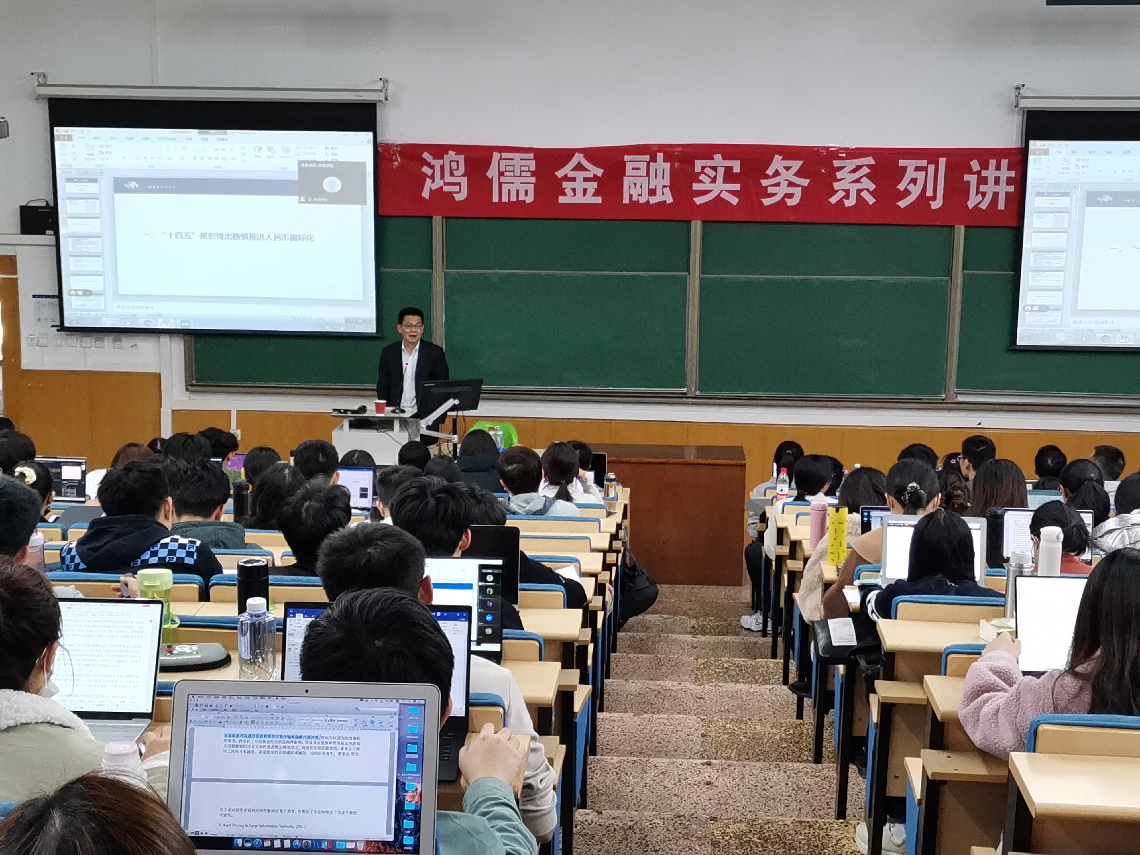 2020年11月19日,鸿儒金融实务系列讲座第三场在博学楼301教室举行,本次讲座由国家外汇管理局外汇研究中心主任丁志杰教授主讲、金融学院院长邹亚生、副院长张海洋、王天一及党委副书记王春蕾及部分学院老师出席了本次活动,讲座现场座无虚席,200多名硕博研究生现场参与,同时还有近百名老师和同学通过线上方式实时观看。