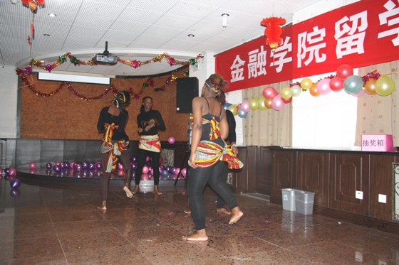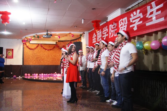 晚会在一支由 2012 级全体同学共同演绎的现代舞曲《 Jing bells 》中拉开了帷幕,他们用热情与活力为大家展现了现代舞的魅力。随后,来自蒙古、俄罗斯、刚果、哈萨克斯坦等国家和地区的留学生为观众们献上了各自国家的舞蹈。多国风情的展示,让舞台美轮美奂。晚会形式多样、精彩纷呈,异域风情与中国传统文化的集合,突显了文化交融的和谐主题。金融学院全体留学生联袂表演了一个又一个精彩的节目。全体俄罗斯留学生用俄语演唱了《新年快乐》, 2013 级全体留学生用中文演唱了《挑花朵朵开》、《对外面的女孩看过来》,日本留学生吉他独奏《 Mental pressure 》,精彩的表演博得了现场观众的阵阵掌声。晚会特设全勤奖颁奖仪式,对上一学年没有迟到旷课的学生予以表彰,全院共 10 名学生获此殊荣。此外,还穿插了游戏和抽奖环节,极大地提高了在场同学的积极性和活跃度,使得整场晚会的气氛不断高涨。在欢快的歌曲《圣诞已降临》的美妙歌声中,各国同学用自己国家的语言祝愿新年快乐,晚会圆满收官。整场晚会历时三个小时,展现了各国留学生的风采,也使留学生在中国提前度过了一个愉悦而令人回味的新年夜。