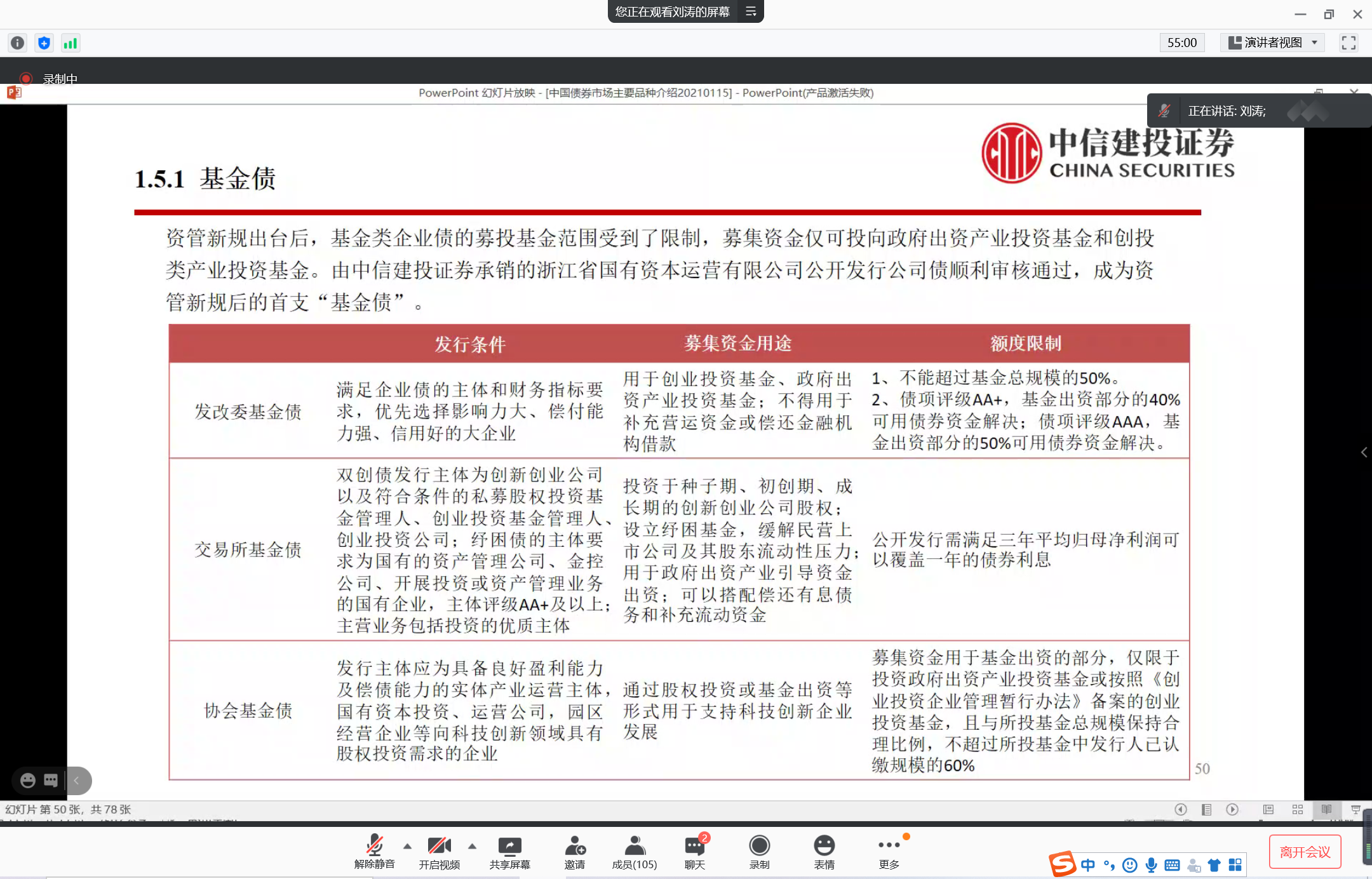 刘总首先介绍了我国债券产品的存量情况及品种分类,结合最新政策法规和实务经验详述了各债券产品的优势、发行条件等重要内容,展现了不同债券产品的特点和区别。随后介绍了创新债券产品类型,如基金债、绿色债等,并对平台公司的搭建方式和市场化转型进行了详细展示。最后,在长达一个多小时的交流互动环节中,王剑锋老师探讨了我国直接融资比重较低的问题,杨冬梅老师对基金债是否增加了地方政府隐形债务进行了交流,贺炎林老师对债券发行和银行贷款审批条件进行提问,陈涛老师咨询了债券市场化定价方式等。