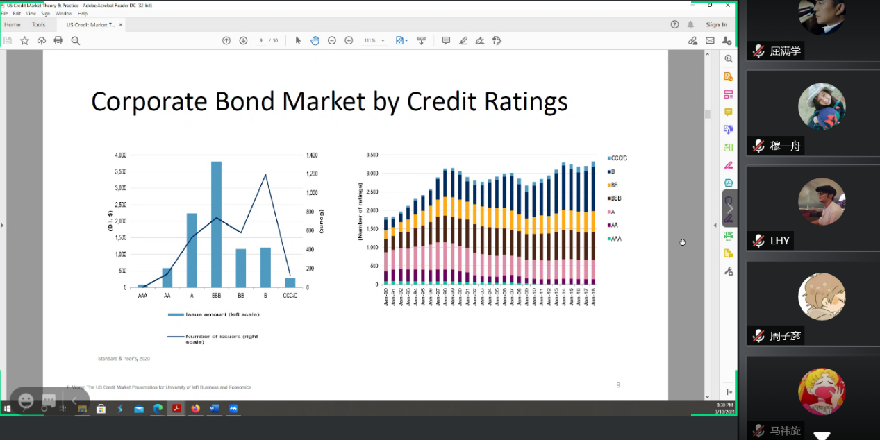 首先,王凡博士简要介绍了美国债券市场概况。美国固定收益债券在全球市场中的份额高达40%。美国固收市场的主要品种的公司债,其次是市政债。公司债的发行主体以金融公司为主,科技类公司较少。债券级别大部分为3B及以上投资级别,但是发行主体级别以2B或B等投机级为主。公司债的主要投资人是共同基金、保险公司等机构投资者。