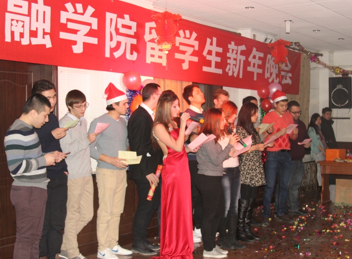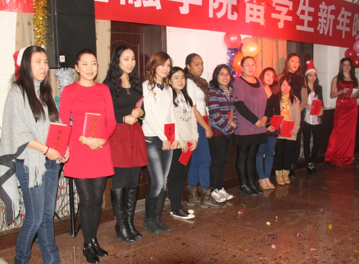 晚会过程中还进行了全勤奖颁奖仪式,对上一学年没有迟到旷课的学生予以表彰,全院共12名学生获此殊荣。此外,晚会中穿插了游戏和抽奖环节,极大地提高了在场同学的积极性和活跃度,使得整场晚会高潮迭起,精彩纷呈。在令人感动的《朋友》的歌声中,各国同学用自己国家的语言祝愿新年快乐,晚会圆满结束。会后学院领导和老师与留学生们亲切合影。整场晚会展现了各国留学生的风采,使留学生在中国提前度过了一个令人回味的新年夜。