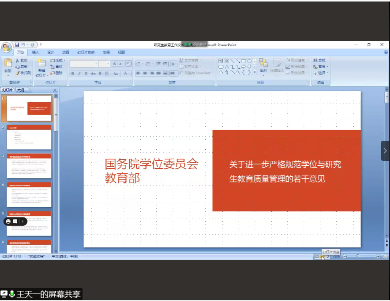 之后,王老师又传达了国务院学位委员会和教育部下达文件《关于进一步严格规范学位与研究生教育质量管理的若干意见》,从出台背景、培养全过程监控与质量保证、强化指导教师质量管控责任、健全处置学术不端有效机制、加强教育行政部门督导监管、答记者问等方面进行了全面的解读。