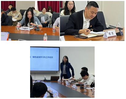 交流环节,牛璐莹、田建等围绕“联合解决发展难题”展开讨论,就同学们关心的实习申请、课题研究、工作招聘等问题答疑解惑。吴笛带来了一场关于“绿色金融”的专题分享,解读了绿色金融及绿色租赁的概念、特色产品和发展趋势,为同学们提供了关于绿色金融、绿色债券等研究方向的参考。随后,博士生党员们就课题研究、绿色金融以及国际绿色金融合作等方面进行了交流探讨。