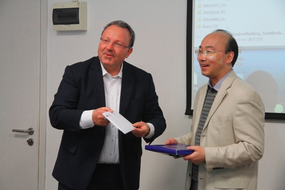 首先,无码动漫 的张海云教授发表了以中国金融市场为主题的演讲。张教授系统地介绍了债券市场、股票市场、金融衍生品市场的现状,并按时间脉络梳理了中国金融市场的发展路径,然后从外部与内部均衡的角度分析了中国金融市场发展的六个主题。演讲结束后,列支敦士登大学的师生就中国的资产证券化、影子银行提出了问题,张教授一一做出了详细的解答。之后,列支敦士登大学Marco Menichetti教授向张教授赠送了具有当地特色的书籍和邮票。
