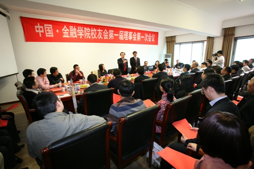 2011 年 3 月 20 日 下午两点,中国·金融学院校友会第一届理事会第一次会议在博学楼925隆重召开。金融学院院长丁志杰、金融学院分党委书记郭敏、金融学院副院长邹亚生、金融学院原院长吴军出席会议,金融学院分党委副书记滕云主持。近60名各界校友代表参加了此次会议。