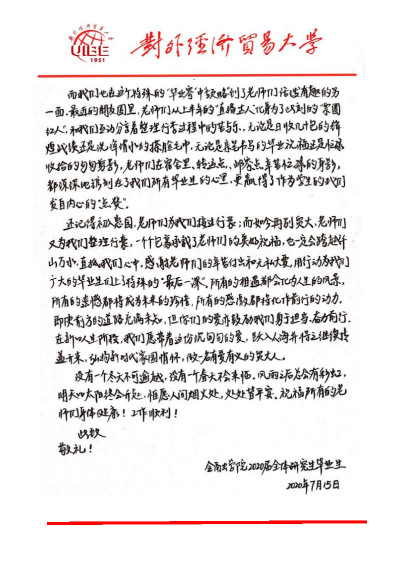 金融学院2020届全体研究生致学院的感谢信