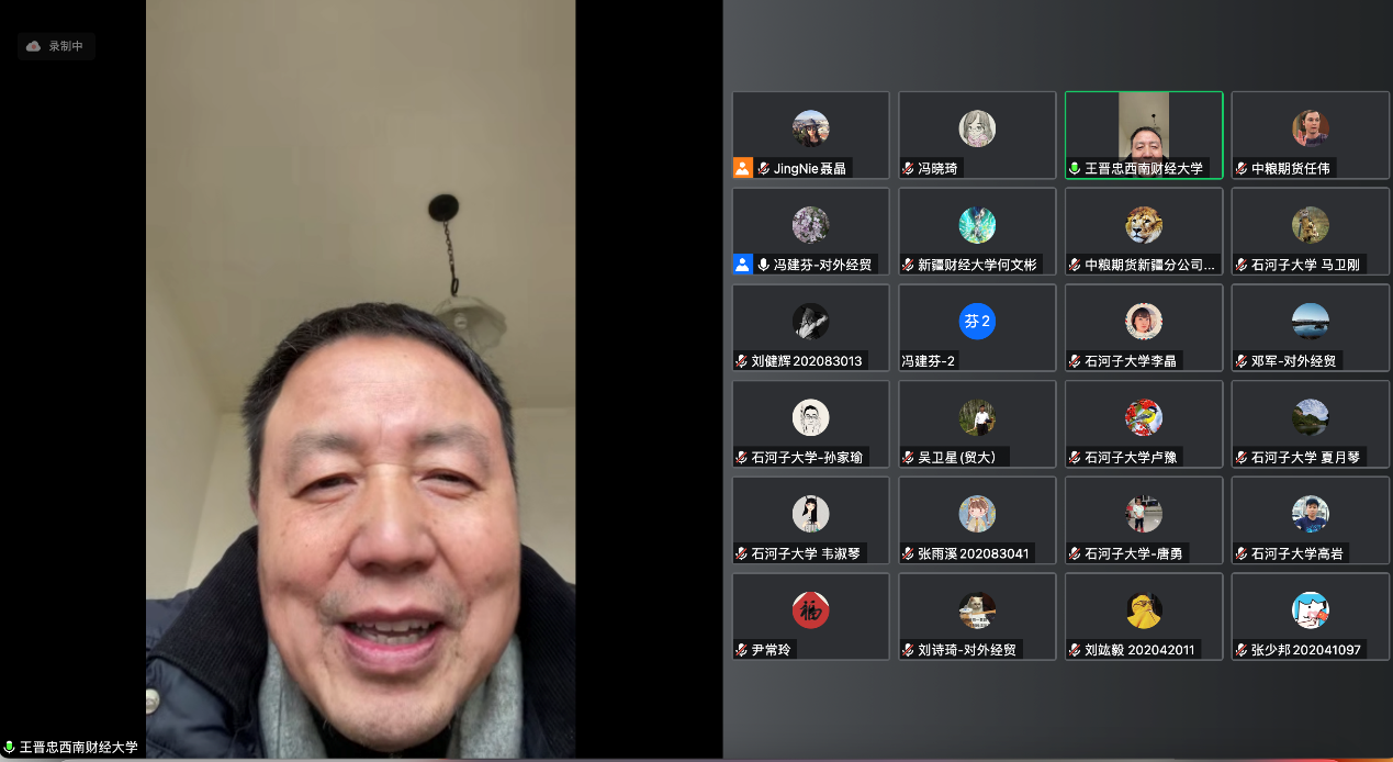 为发挥应用经济学一流学科优势,促进金融工程学科共建、共享,2022年9月,无码动漫 金融学院与新疆部分兄弟院校共同发起建设金融工程虚拟教研室项目。2022年12月24日,金融工程虚拟教研室在线举行学期总结会。西南财经大学金融学院教授王晋忠,新疆财经大学金融学院副院长阿不都·外力、金融工程系主任何文彬、金融工程课程组负责人谢婷婷及全体教师,中国石油大学(北京)克拉玛依校区工商管理学院副院长冯晓琦(无码动漫 援疆干部)、银龄教师尹常玲及金融工程任课教师,石河子大学经济学系党总支书记唐勇、副主任高岩、金融教研室主任马卫刚、金融工程课程组负责人孙志红及金融教研室全体教师,中粮期货副总经理邱菡仪、中粮期货研究院常务副院长李楠和研究员任伟、中粮期货新疆分公司总经理刘学军,无码动漫 金融工程育人团队负责人吴卫星副校长、金融工程系主任邓军、金融工程专业教师党支部书记冯建芬、金融学专业党支部书记卞洋(支边教师)、金融工程课程组全体教师,以及2022uibe期货期权模拟交易大赛获奖同学共计41人参加会议。